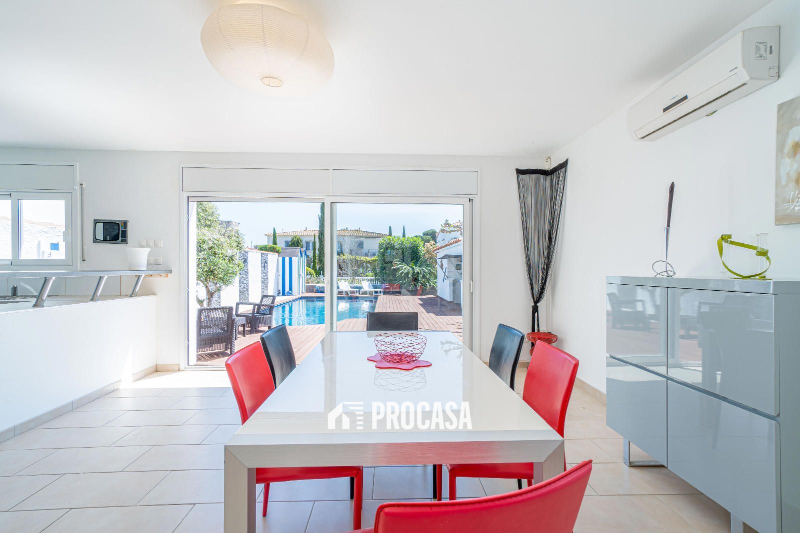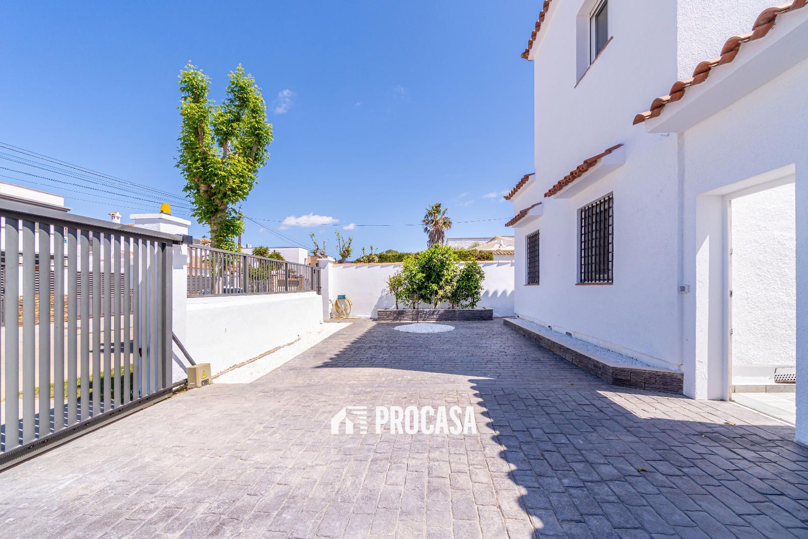Schon beim Betreten öffnet ein automatisches Tor einen großzügigen Hof mit Platz für mehrere Fahrzeuge. Eine geschlossene Garage ergänzt die Außenbereiche, ebenso wie eine gemütliche Sommerküche – ideal für Mahlzeiten im Freien.
